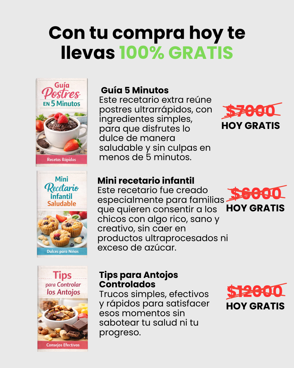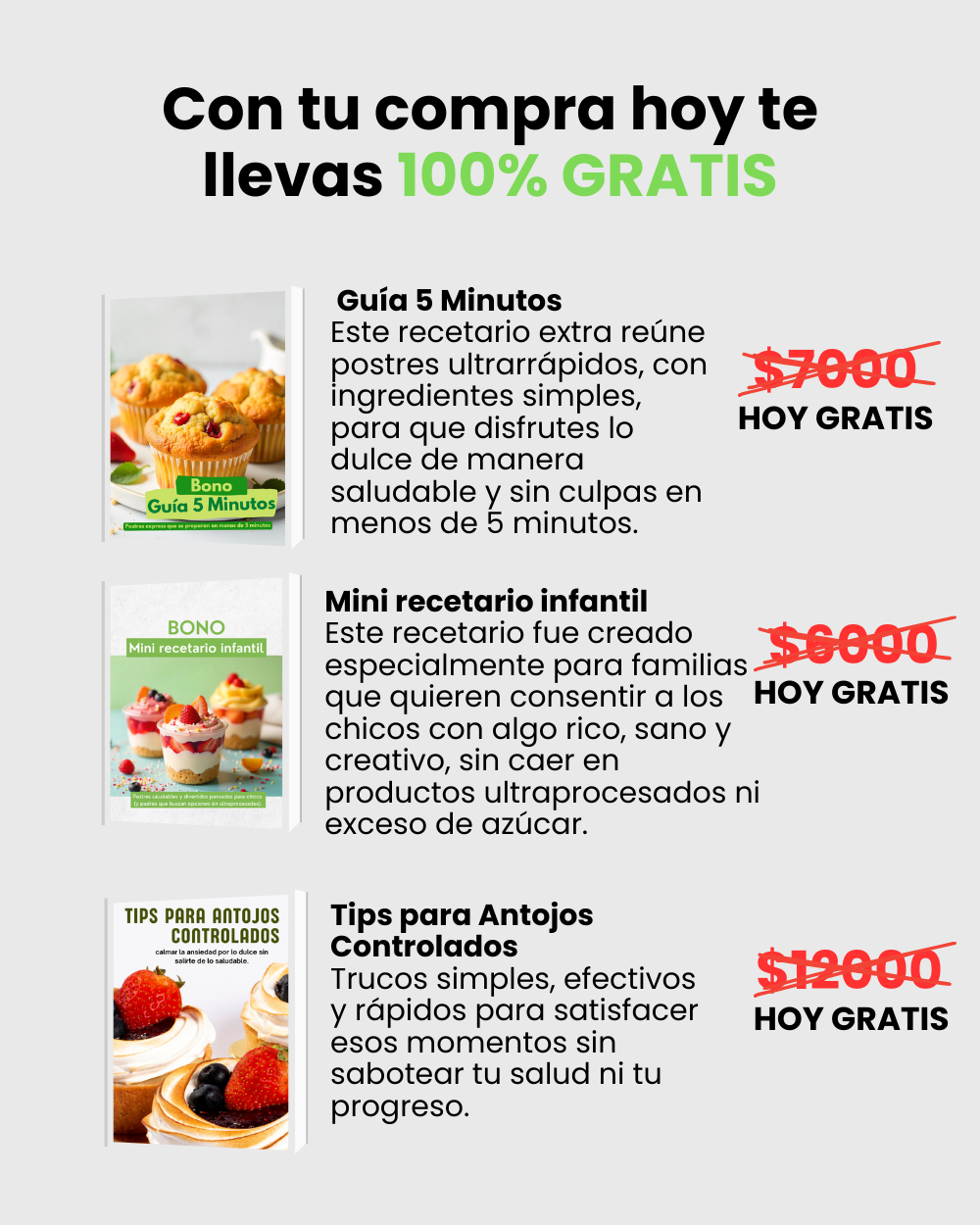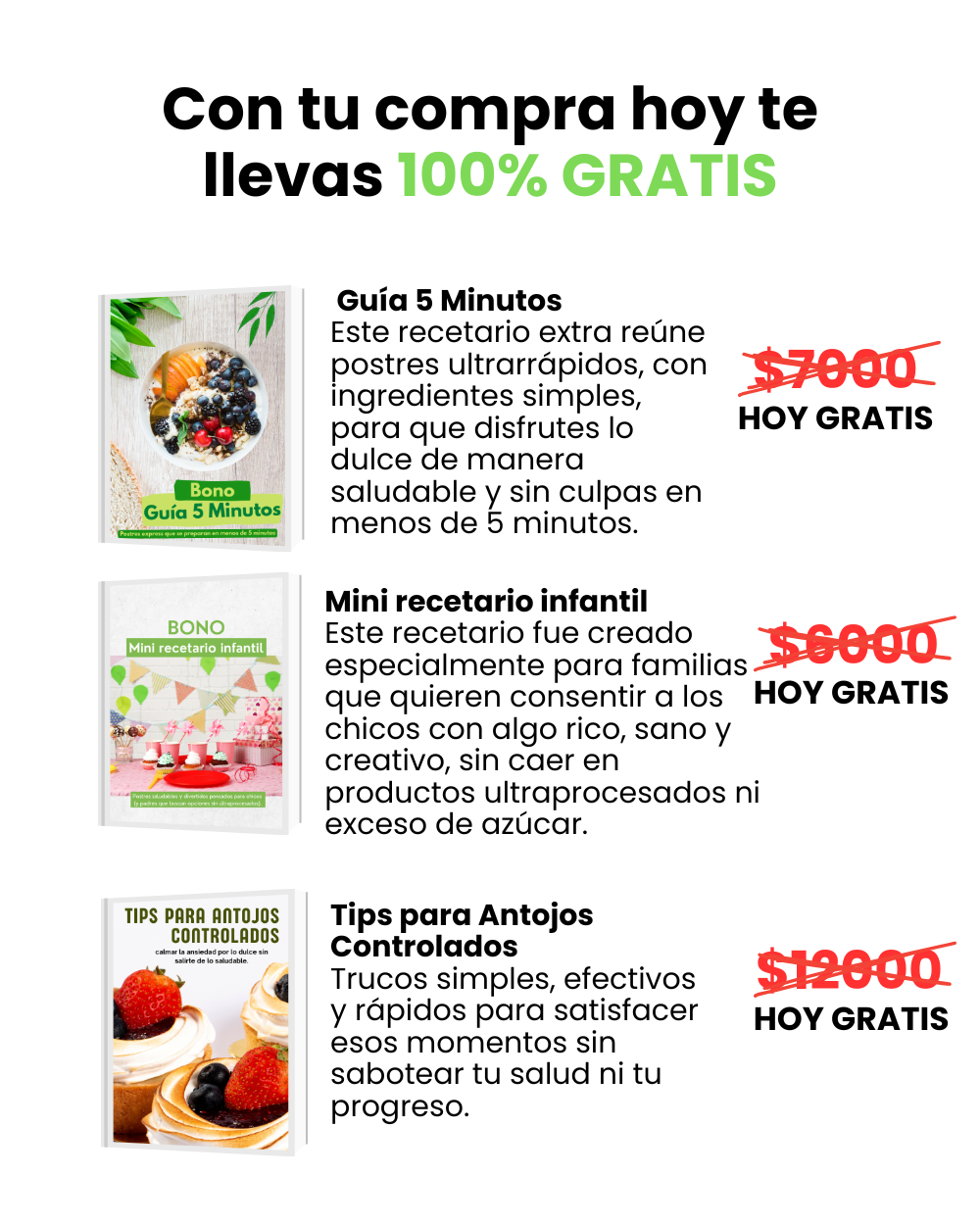 Además del recetario con más de 250 postres, te llevás 3 bonos exclusivos: